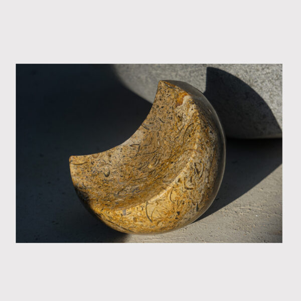 The defining feature of this piece is its dramatic, crescent-shaped void. This deliberate carve-out creates a play of light that defines the “dance” between the moon and the sun, allowing for shifting shadows as the ambient light in a room changes throughout the day. It represents a moment of alignment—a frozen eclipse that speaks to the balance of the universe.