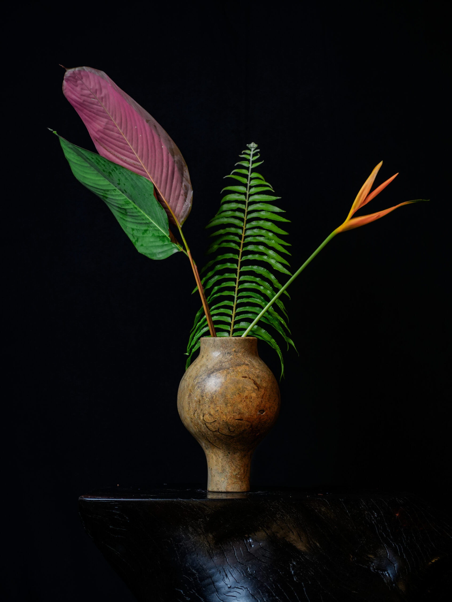As a signature element of the VAS-GLOR series, the Footed Globe Vase is designed for high-impact styling. Its substantial weight and elevated profile make it the perfect foundation for dramatic tropical arrangements, as seen with the vibrant heliconia and lush ferns in our collection. The flared rim and narrow neck are precision-bored to hold stems securely, while the weighted base ensures stability even with top-heavy botanicals. Whether placed as a central dining table centerpiece or as a solitary object on a minimalist console, this vase bridges the gap between raw, primitive nature and high-concept contemporary art.