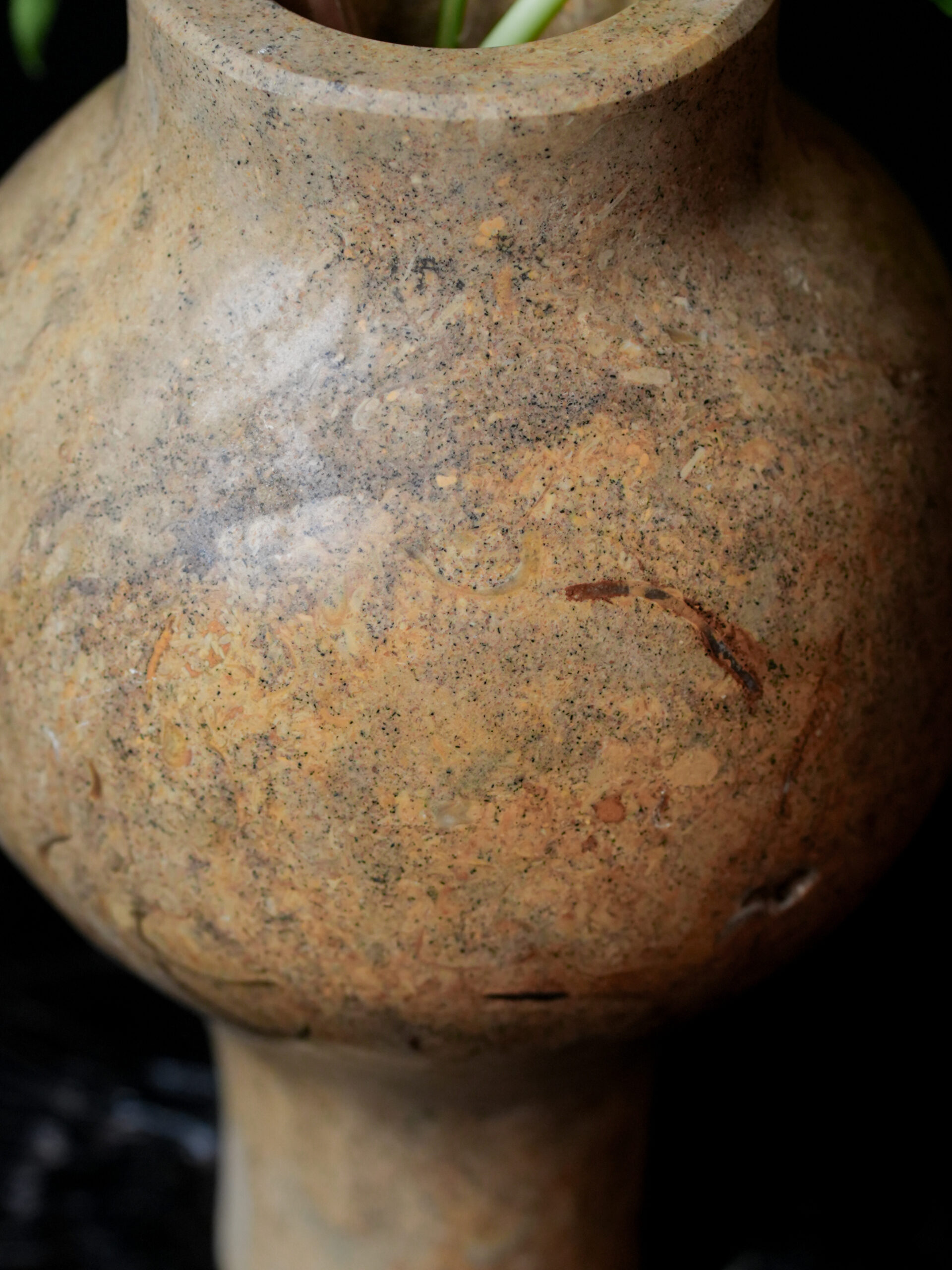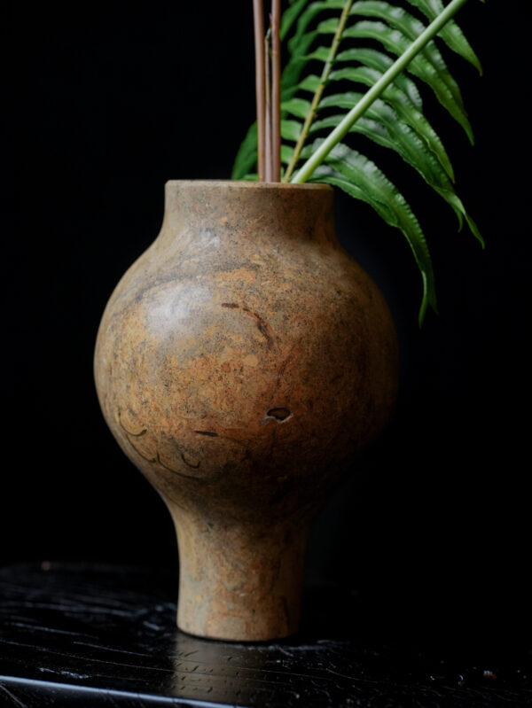 The Limited Edition Glauconite Rock Footed Globe Vase represents the pinnacle of our stone-carving craftsmanship. This exceptional vessel is shaped from a singular block of authentic glauconite, a mineral-rich rock prized for its unique “speckled” appearance and deep, earthy color palette. Standing 9 inches high and 5 inches at its widest point, the vase’s design focuses on volume and verticality, using a raised pedestal base to lift the heavy stone and give it a sense of graceful importance.
