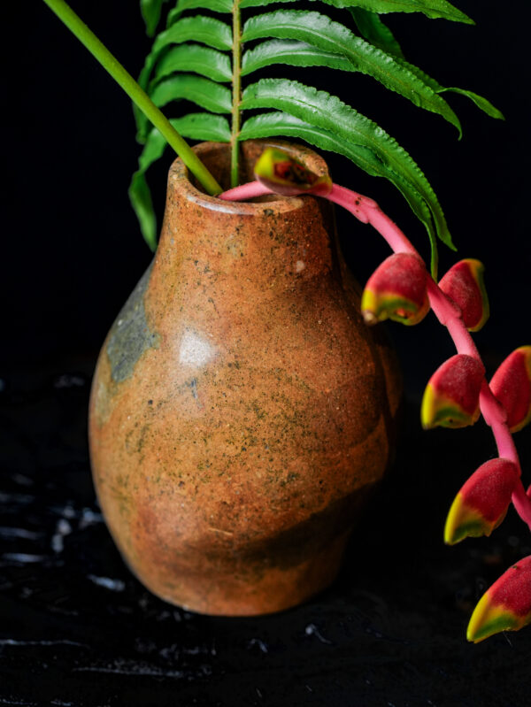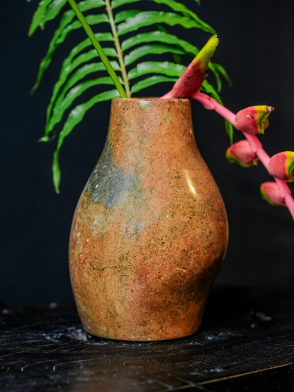 Measuring 8 inches in height with a 5-inch diameter, this variation focuses on fluidity and grace. The silhouette is defined by its elegant curves: a substantial, rounded base provides exceptional stability, while the narrowing at the center creates a visual “cinch” that leads the eye toward the softly flared rim. This classical yet modernized form is hand-buffed to a tactile, smooth finish, highlighting the rich “landscape” of mineral veining—ranging from desert tans to deep, oxidized ambers—that flows across the contours of the stone.