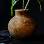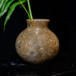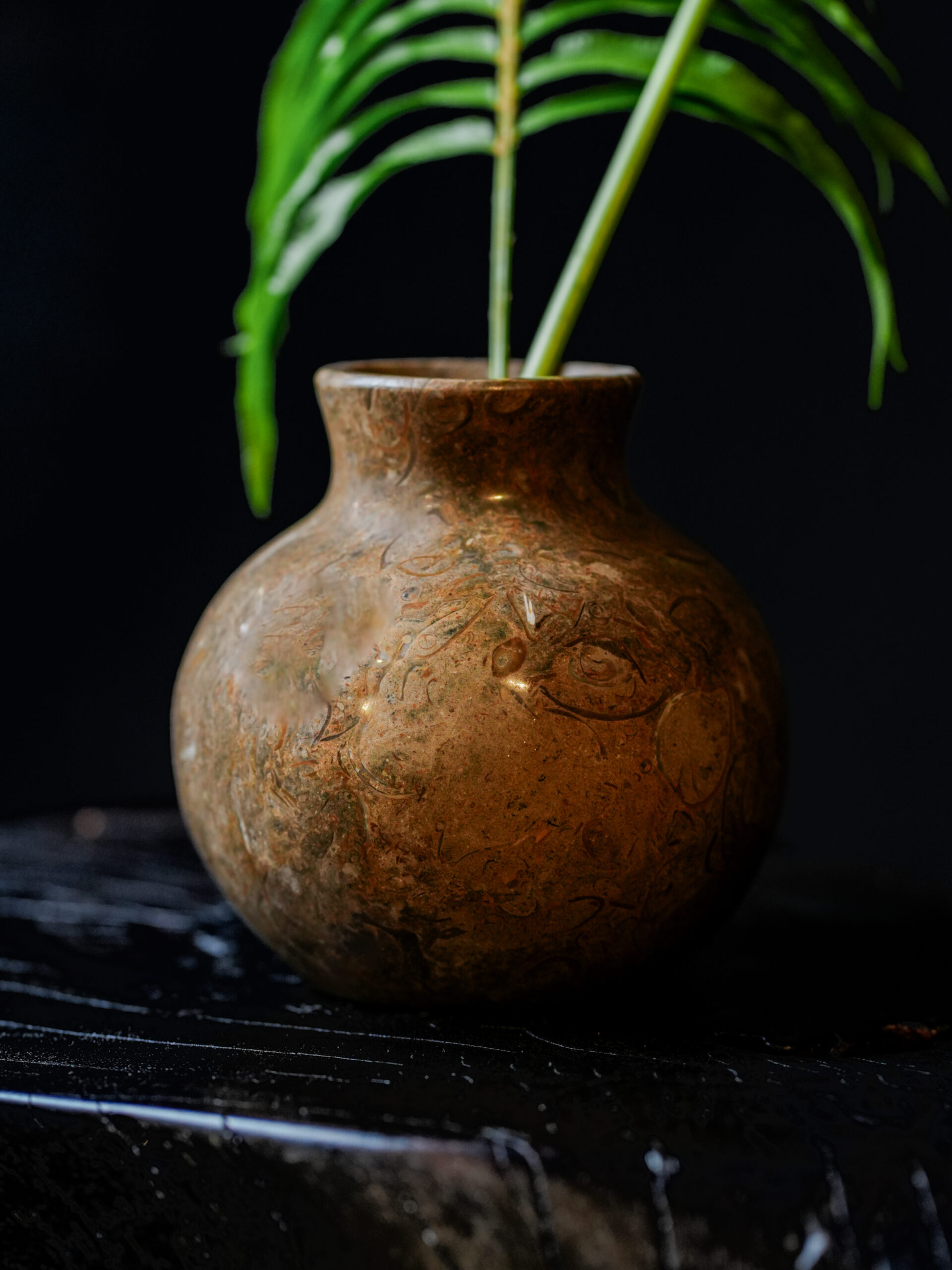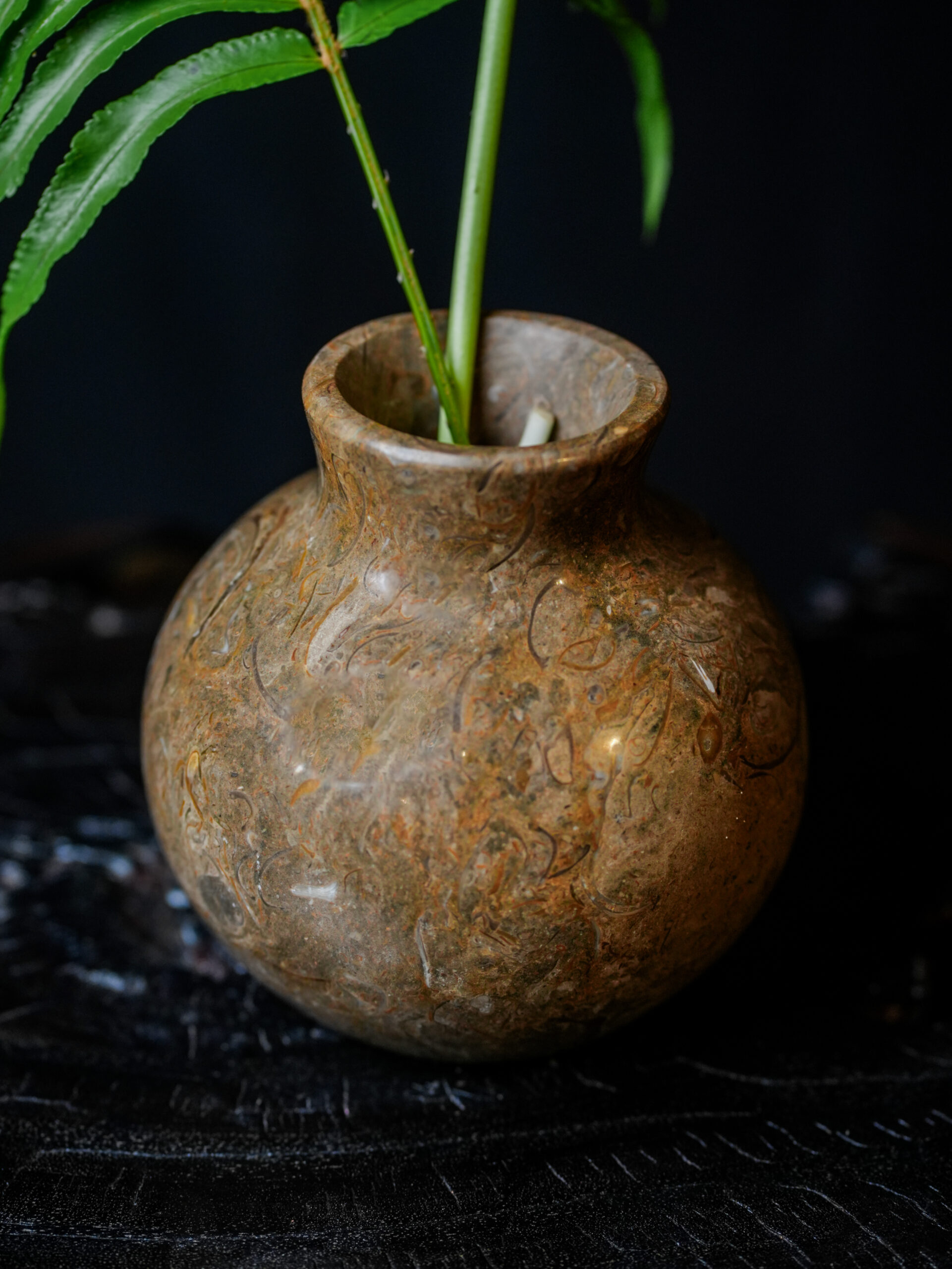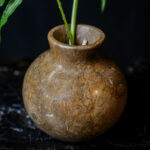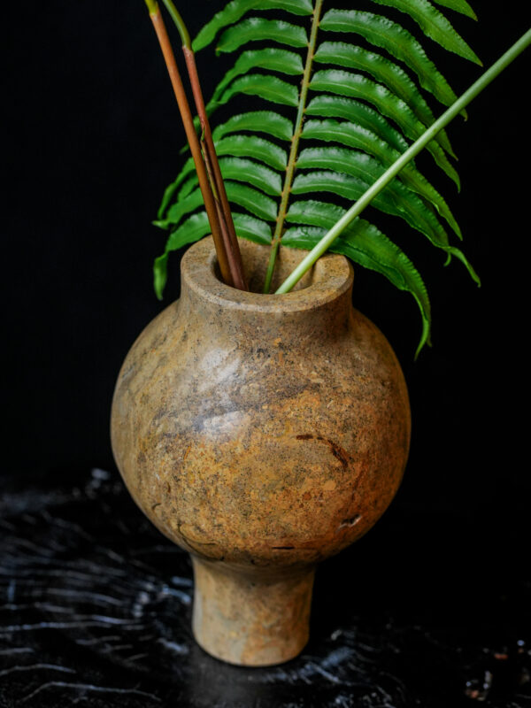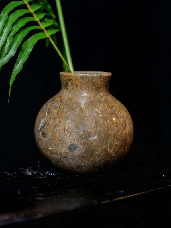 Measuring 4 inches in height and 4 inches at its widest point, the vase features a weighted, spherical base that provides exceptional stability. The surface is hand-polished to a soft matte sheen, revealing a painterly array of earthy tones, including sun-baked ochre, muted sage, and oxidized amber. This smooth finish not only enhances the tactile quality of the rock but also highlights the dense mineral inclusions and “fossil-like” patterns that make every piece in the VAS-GLOR series a one-of-a-kind original.