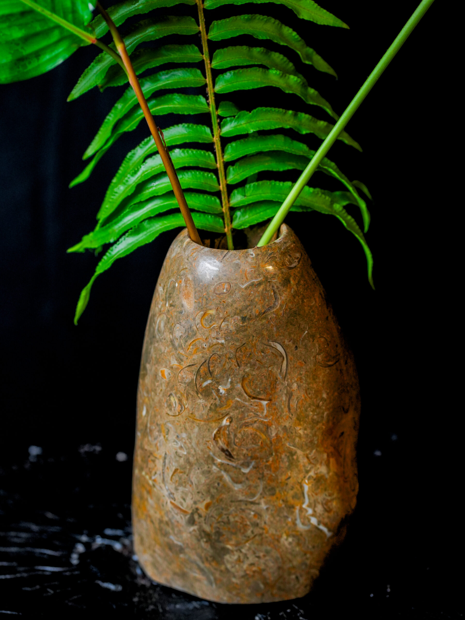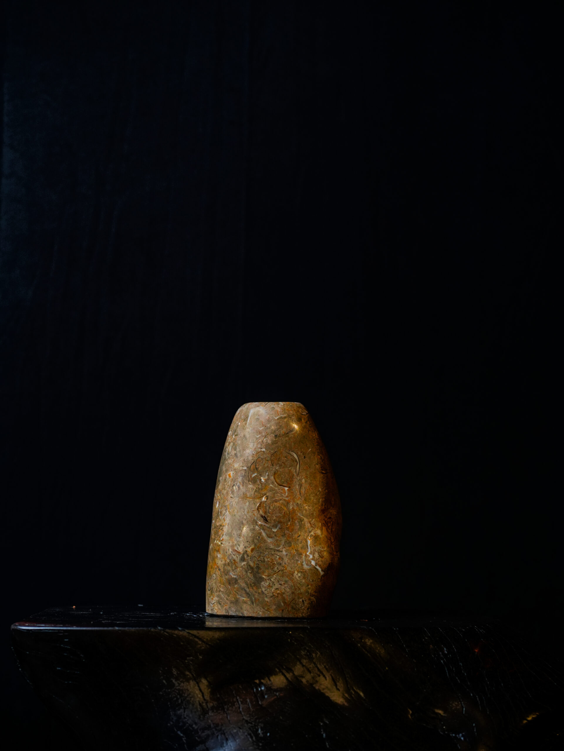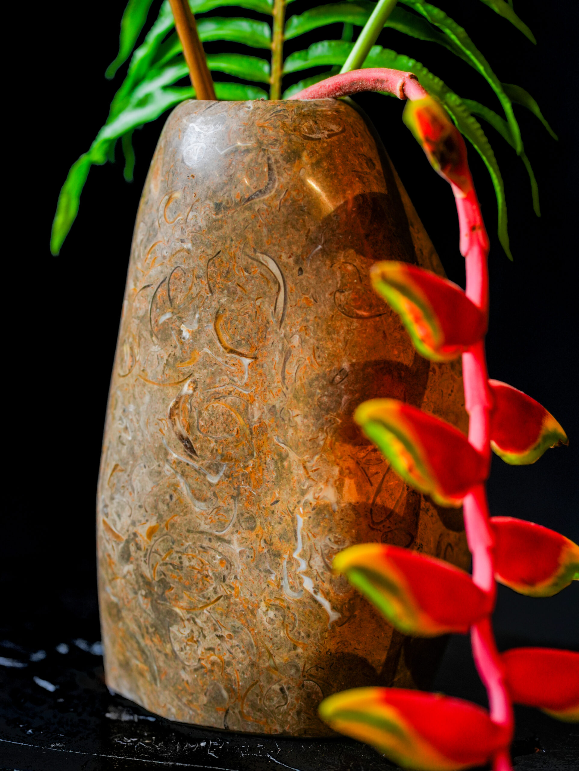 As part of our exclusive Limited Edition (VAS-GLOR) series, the Tapered Shield Vase is designed for the discerning collector. Its substantial weight and broad footprint provide exceptional stability, while the precision-bored opening is ideal for displaying bold, structural botanicals—such as the vibrant heliconia and lush ferns shown in our collection. Whether placed on a minimalist concrete console, a dark wood mantle, or as part of a grouped stone gallery, this vase serves as a powerful, grounding focal point. It is more than a decorative object; it is a silent totem of the earth’s enduring strength and beauty.