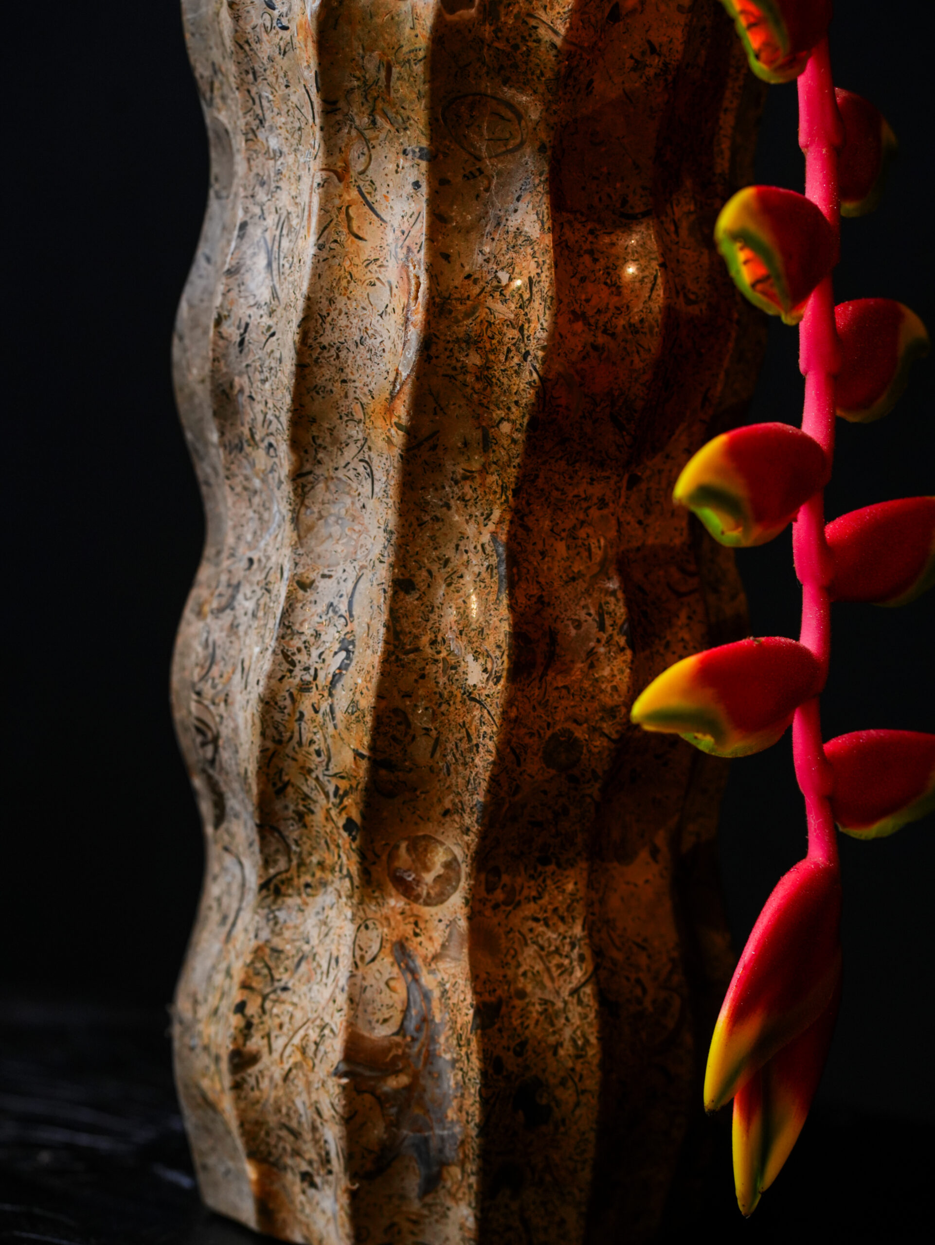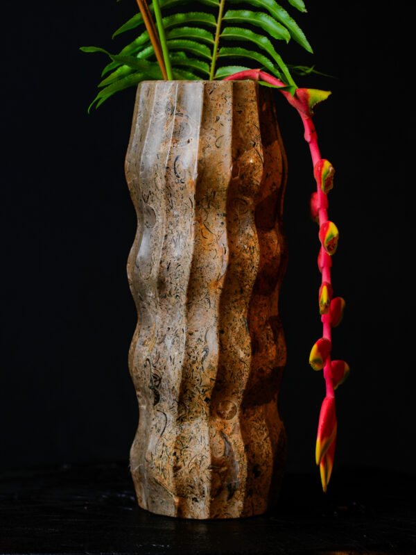 The Limited Edition Glauconite Rock Wavy Fluted Vase is a stunning celebration of texture and form. Carved from a single block of authentic glauconite, this vessel brings the geological narrative of the earth directly into your home. The stone itself is a marvel of natural art, featuring a speckled composition of warm tans, charcoal greys, and deep ferruginous reds that shift and change depending on the light.