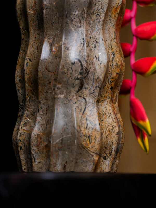 Measuring 9 inches in height with a 4-inch diameter, this variation focuses on verticality and movement. The distinctive wavy fluting is hand-chiseled to create a series of soft ridges and valleys, providing a tactile experience that invites touch. This rhythmic carving technique highlights the internal “movements” of the rock, making the heavy mineral appear light and fluid. The result is a piece that feels both prehistoric and avant-garde.